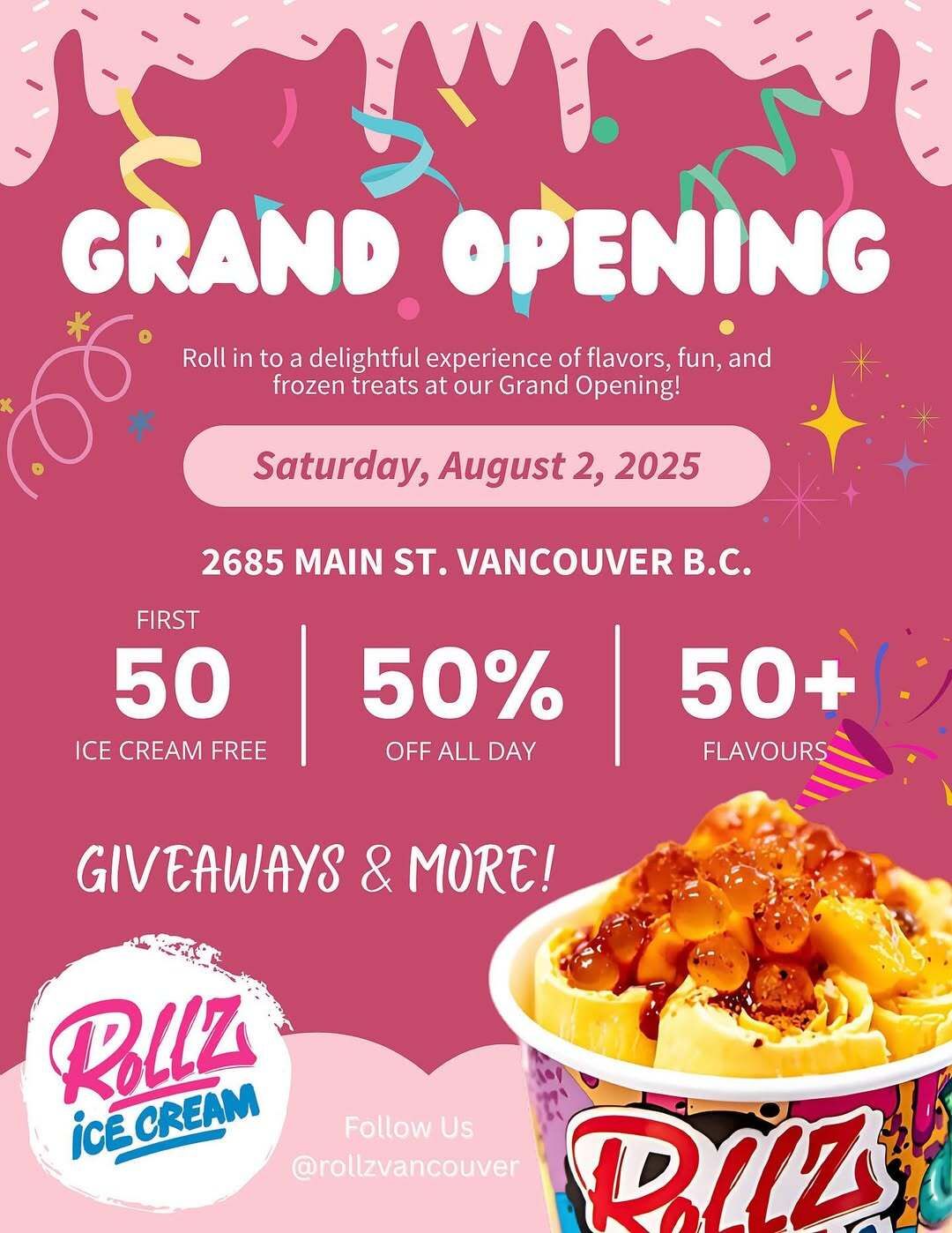 1.🍦 Rollz Grand Opening - Free ice cream for first 50 patrons; August 2nd; 50% off all orders rest of day at 2685 Main St, Vancouver